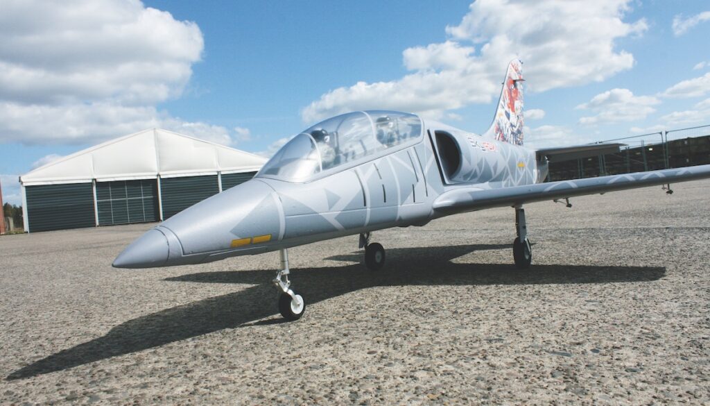 In Semi-Scale-Ausführung und in einem interessanten Design präsentiert sich die Aero L-39 »Skyfox« als Neuheit im Lieferprogramm von Kavan. Die L-39 ist eine hochwertige EPO-Schaumkonstruktion mit einer stabilen, glatten Oberfläche, die zum einen mit aufgebrachtem Design (Prototypendesign des Originals) oder ohne Design (Design nach eigener Wahl) angeboten wird. Das Modell ist in kürzester Zeit flugfertig zu erstellen, aufgrund von Schraubverbindungen. Lediglich für den Heckkonus findet ein wenig Klebstoff Anwendung. Rumpf und Tragwerk sind im Innenbereich mit Kohlefaserverstärkungen und Verbindern zur zusätzlichen Stabilisierung der Struktur des Modells versehen. Das Tragwerk ist einteilig ausgeführt mit eingebauten Servos für die Querruder und die Landeklappen. Seiten- und Höhenleitwerk werden verschraubt, so auch die Verbindung des Leitwerks zur Hecksektion des Rumpfes. Als Antrieb dient ein 80-mm-Impeller mit einem 11-Blatt-Rotor, ausgelegt für einen 6s-Lipo mit einer Kapazität wahlweise von 3.700 bis 5.000 mAh. Das aus Aluminium gefertigte Dreibein-Einziehfahrwerk verfügt über Teleskop-Federbeine mit angesteuertem Bugfahrwerk. LED-Positionsbeleuchtung, Landescheinwerfer und Beacon, die vom Flugakku mit Strom versorgt werden, gehören selbstverständlich zur Modellausstattung des ARF-Sets. Für diejenigen, die ihren »Skyfox« lieber selber designen möchten, wird das Modell auch komplett mit weißer Oberfläche zu einem reduzierten Preis angeboten.