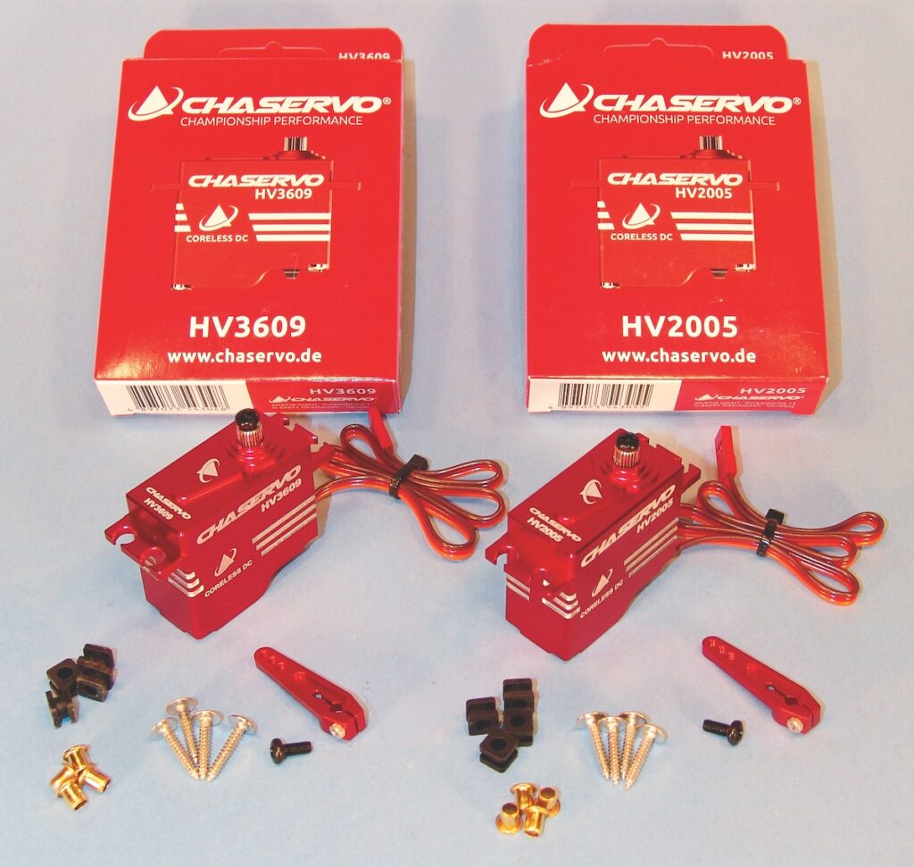Vor geraumer Zeit konnte ich bereits über zwei unterschiedliche CHAservo-Typen berichten: das Low-Profile-Servo HV3512 und die Budget-Type DS20. Beide verrichten bis heute zur vollsten Zufriedenheit und ohne die geringsten Schwierigkeiten ihren Dienst in den jeweils eingesetzten Modellen mit Elektro- bzw. Verbrennerantrieb. Die Servos HV3609 und HV2005 sind direkt über den CHAservo-Onlineshop oder diverse Händler lieferbar und gehören zu klassischen Servos in Standardabmessungen. Dies bedeutet grob eine Breite von 20 mm bei 40 mm Länge (ohne Anschraubflansche). Beim Studium des aktuellen CHAservo-Prospekts bzw. der Homepage fällt die Erweiterung des Lieferprogramms um viele spezielle Abtriebshebel und -scheiben aus Metall auf. Hier fährt man mittlerweile seine ganz eigene Linie und bestückt die Servos neuester Produktion, wie die beiden oben genannten, konsequent ab Werk mit Premium-Aluminiumhebeln. Damit wird in vielen Fällen das Nachbestellen von teuren After-Market-Hebeln unnötig. Eine sehr gute Entscheidung, wie ich finde.